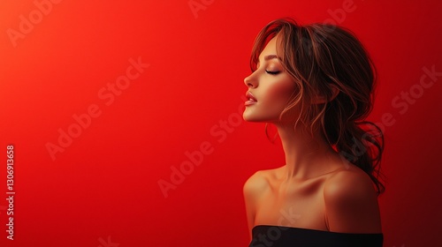 Elegant profile of a woman against a vibrant red background, exuding calmness and beauty