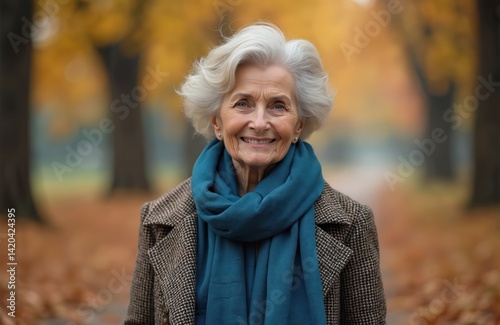 Elegant senior woman in coat smiles. Elderly lady enjoys walk in autumn park, fallen leaves, fall season. Fashionable stylish elderly woman with silver hair and blue scarf outdoors.