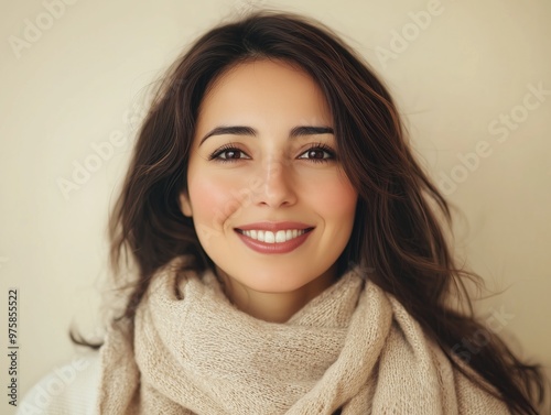 Elegant Smiling Young Woman with Natural Makeup and Wavy Hair on Neutral Background.