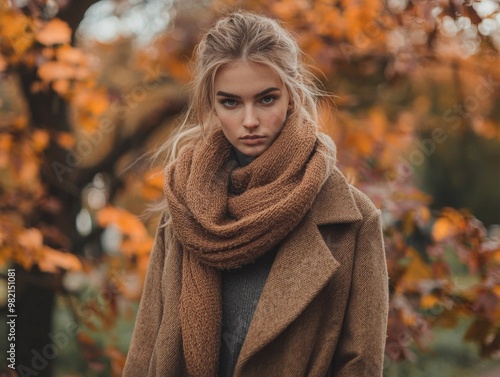 Elegant Woman in Autumn Streetwear Posing in Vibrant Outdoor Nature Setting