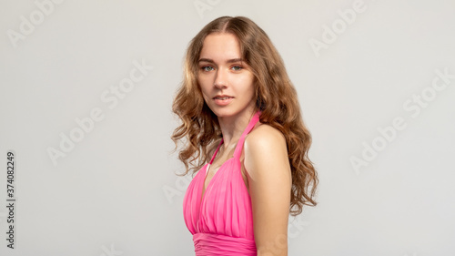 Elegant woman portrait. Feminine beauty. Tender brunette lady in pink with curly hair natural makeup looking at camera isolated on neutral empty space background.