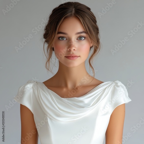 Elegant Woman Posing in a White Dress in Studio with Soft Lighting for Bridal Fashion Shoot