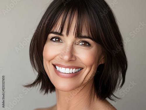 Elegant woman with dark brown shoulder-length bob hairstyle and bangs showcasing a radiant smile after dental work, set against a light gray backdrop. Natural beauty and dental health concept.