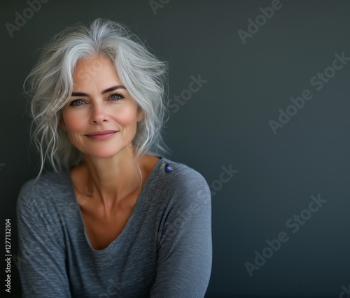 Elegant woman with silver hair poses against a plain, dark-colored background