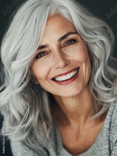 Elegant Woman with Silver Hair Smiling in Natural Portrait Setting