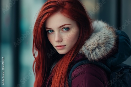 Elegant young woman cherry red hair in winter coat with fur hood posing outdoors