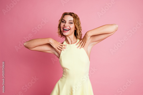 Elegant young woman in a charming yellow dress posing joyfully against a bright pink backdrop, expressing happiness