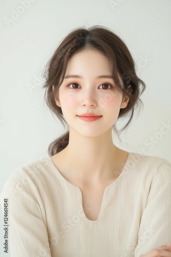 Elegant Young Woman in Soft Pastel Dress with Natural Makeup