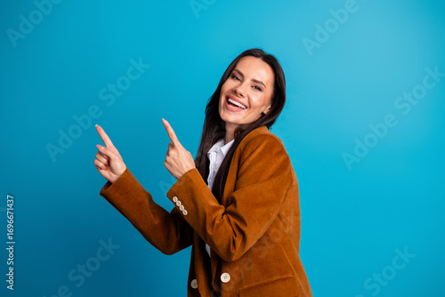 Elegant young woman in stylish jacket poses against a blue background, exuding positivity and confidence in a professional setting