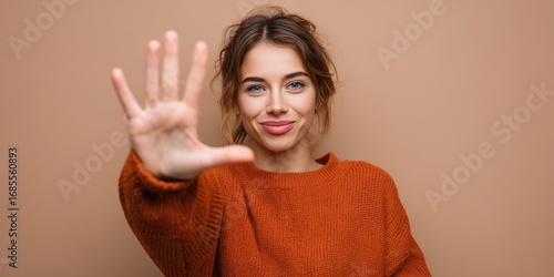 Elegant Young Woman Showcasing Hand Gesture Against a Solid Backdrop