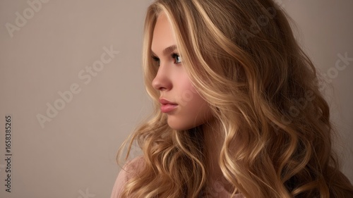 Elegant young woman with wavy blonde hair, neutral background. Neural network AI generated