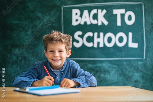 Elementary school boy sitting at a desk, chalkboard with text Back To School