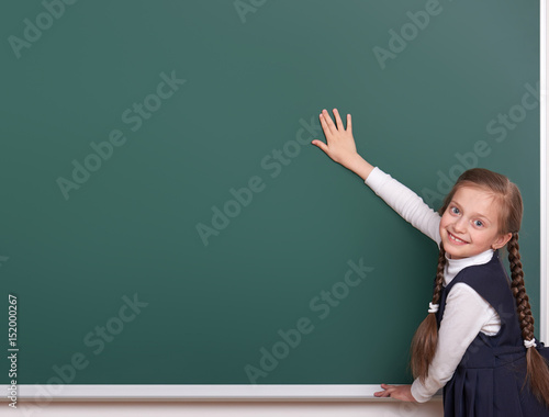 elementary school girl put hands on chalkboard background and show blank space, dressed in classic black suit, group pupil, education concept
