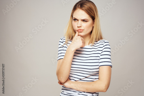Emotional blonde woman in striped t-shirt lifestyle facial expression close-up