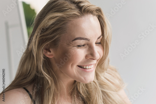 emotional close-up portrait of a blonde woman with gorgeous hair. Sexy blonde smiles and enjoys life