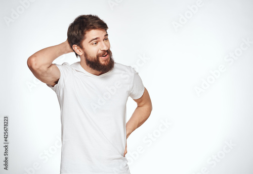 Emotional guy in a white t-shirt on a light background emotions model cropped view of a student