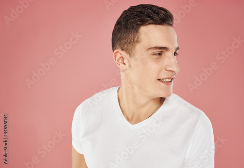 emotional man in t-shirt gesturing with hands emotions isolated background