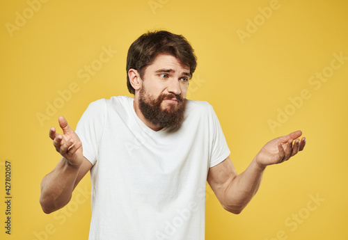 Emotional man on a yellow background in a white t-shirt thick beard brunette model