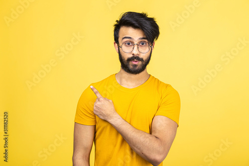 Emotional portrait of a Hindu man in a yellow T-shirt on a bright orange background