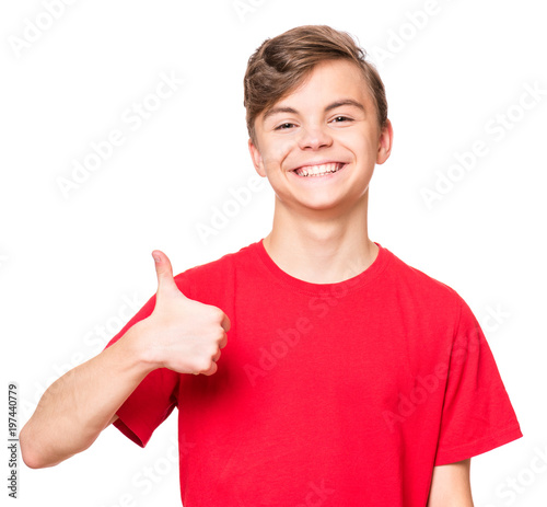 Emotional portrait of caucasian smiling teen boy making thumb up gesture. Handsome funny teenager wearing red t-shirt, isolated on white background. Happy child looking at camera.