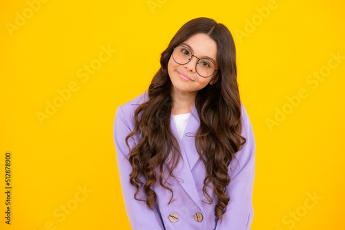 Emotional portrait of caucasian teenager child girl isolated on yellow background.