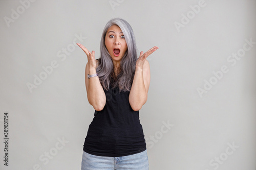 Emotional portraits of a paled long hair asian matured woman on grey background