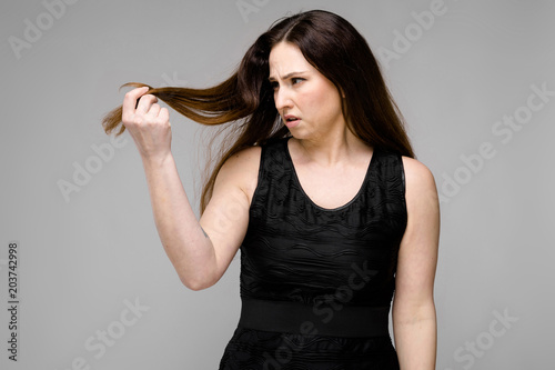 Emotional pretty confident upset plus size model with poor hair standing in studio on gray background