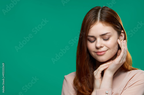 emotional surprised woman holding hands near face studio lifestyle green background