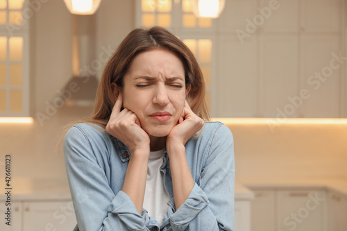 Emotional young woman covering her ears with fingers at home