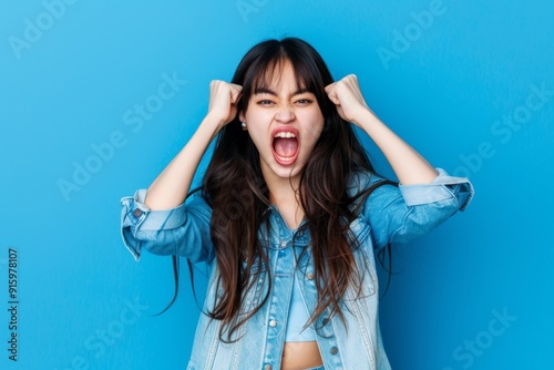 Emotional young woman fierce bold and striking demeanor. Portrait of spirited young female expressive and fierce emotion. Young woman's fiery defiance societal expectations.