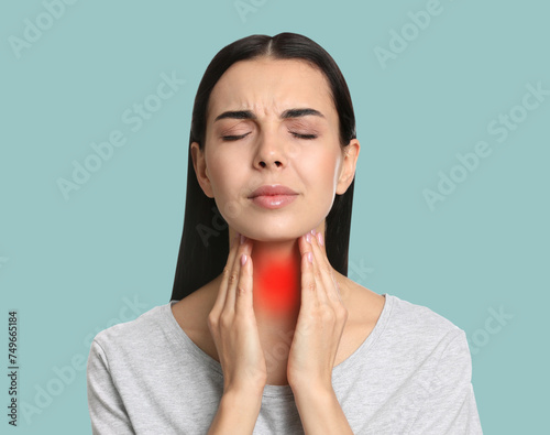 Endocrine system. Woman suffering from pain in thyroid gland on light blue background