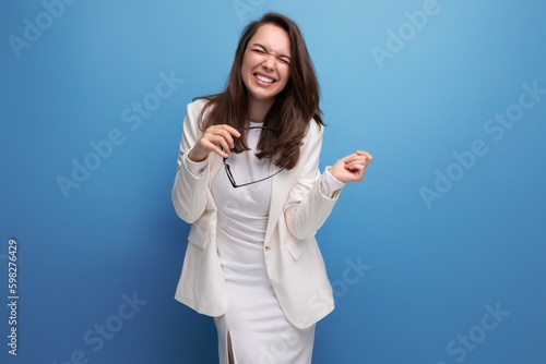 energetic brunette woman in white dress on studio background