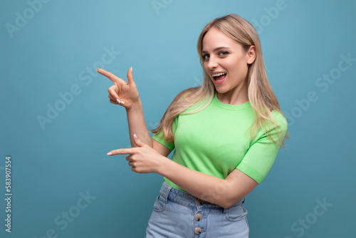 energetic girl in casual outfit pointing at the wall on the left on a blue background