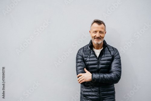 Energetic Senior Man in Sporty Black Jacket Standing Proudly Against Grey Concrete Wall with Copyspace for Inspirational Lifestyle Shot