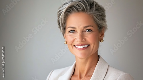 Energized woman in a blazer smiles confidently against a soft gray background in a well-lit shot