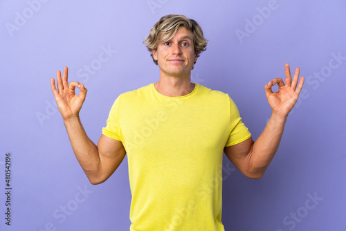English man over isolated purple background in zen pose