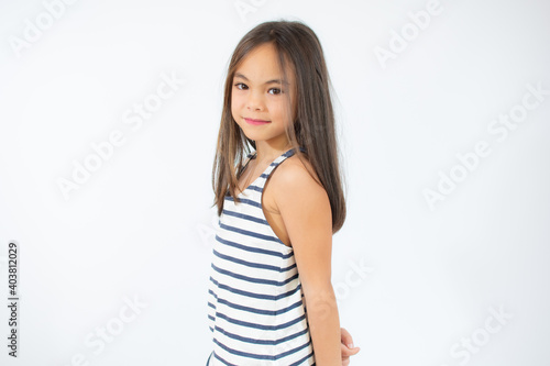 Enjoying vacation. Good vibes. Beach style. Little beauty. Portrait of happy cheerful girl over white background.