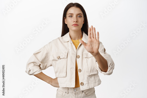 Enough, keep distance. Serious girl extend hand in taboo, stop sign, say no to smth bad, prohibit or restrict smth, rejecting offer, standing over white background