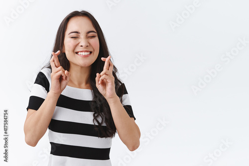 Enthusiastic, hopeful young girl keep faith, feeling lucky and amused as awaiting something important, begging for good news, keep fingers crossed, smiling with closed eyes, praying or make wish