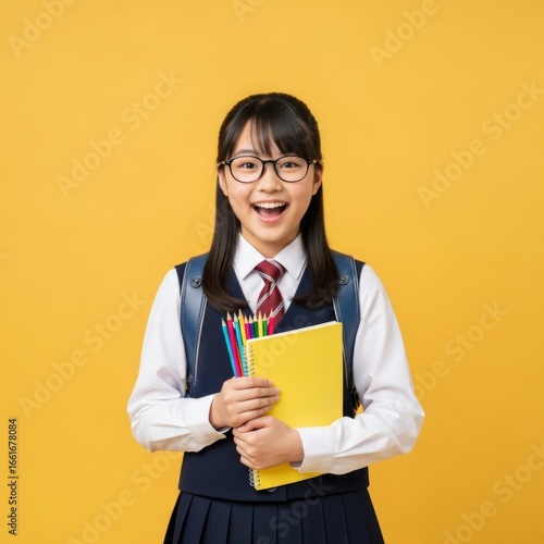 Enthusiastic Student Ready for Learning A Smiling Girl Holding Books on a Yellow Background, Poised for Academic Success