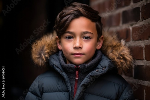 Environmental portrait photography of a glad kid male wearing a cozy winter coat against a brick wall background. With generative AI technology