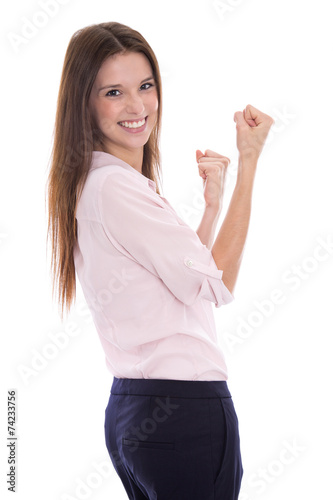 Erfolgreich im Beruf: jubelnde junge Frau isoliert auf weiß