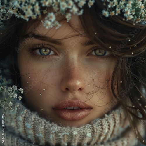 Ethereal Beauty: Closeup of a Woman with Floral Crown and Freckles in Cozy Knit Sweater