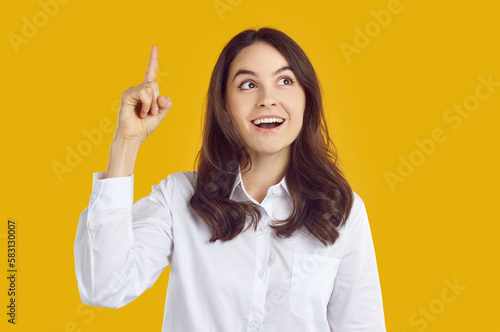 Eureka. Young business woman has a good brilliant genius idea. Portrait of a happy young girl in a white shirt standing isolated on a yellow studio background, pointing her index finger up and smiling
