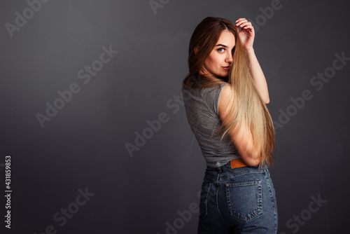 European girl in a gray top and jeans with blond long hair, stands sideways and holds her hand behind her head, looks directly at the wall