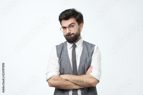 European man in tie, vest and shirt looking sadly at camera. Handsome mature adult with beard lost thinking about future life.