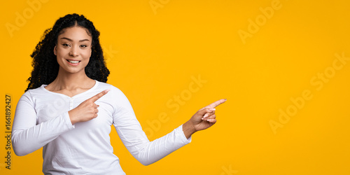 Excited African American Woman Pointing Aside At Copy Space With Two Hands, Beautiful Black Female Showing Empty Place For Your Design Or Advertisement, Standing Over Yellow Background, Panorama