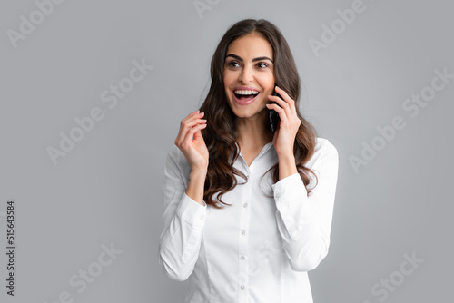 Excited amazed charming brunette woman talking on mobile phone, isolated over gray background. Girl with mobile cell phone.