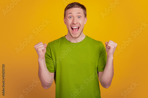 Excited and happy young adult man raised fists up smiling wide standing isolated on yellow background in casual t-shirt