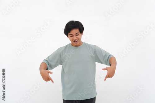 Excited Asian male employee wearing a T-shirt pointing at the copy space below him, isolated by a white background